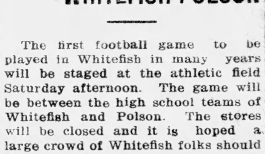 The first home game was played on Saturday, 11/11/1922, against Polson. Shops across town closed for the game, which ended in a tough 33-19 loss for Whitefish. This Whitefish Pilot article (below)from Friday, November 11, 1922, highlighted the game as, "...a small riot, but an exciting riot."